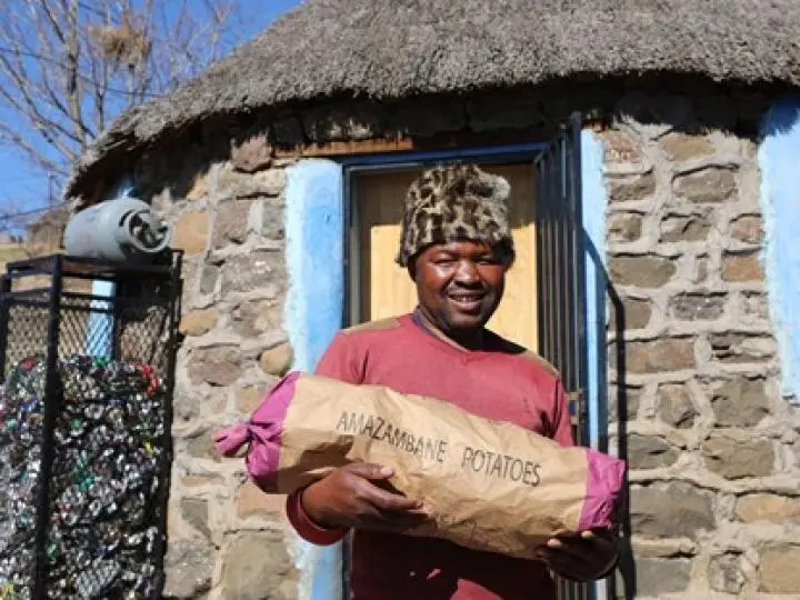 Tseliso posa con una gran bolsa de patatas recién cosechadas, preparadas para el comercio, que simbolizan su trayectoria de empoderamiento y éxito.Tseliso sostiene una bolsa de patatas, símbolo de su nueva mentalidad, su arduo trabajo y el brillante futuro que está construyendo para su familia.