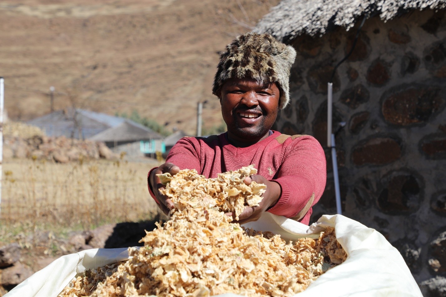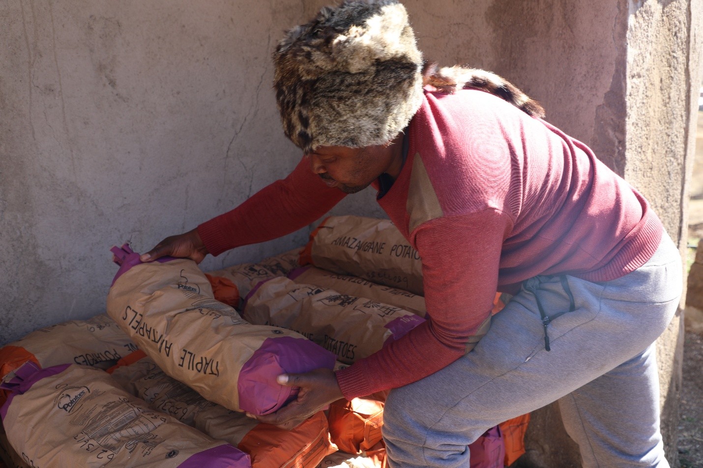 Tseliso posa con una gran bolsa de patatas recién cosechadas, preparadas para el comercio, que simbolizan su trayectoria de empoderamiento y éxito.Tseliso sostiene una bolsa de patatas, símbolo de su nueva mentalidad, su arduo trabajo y el brillante futuro que está construyendo para su familia.